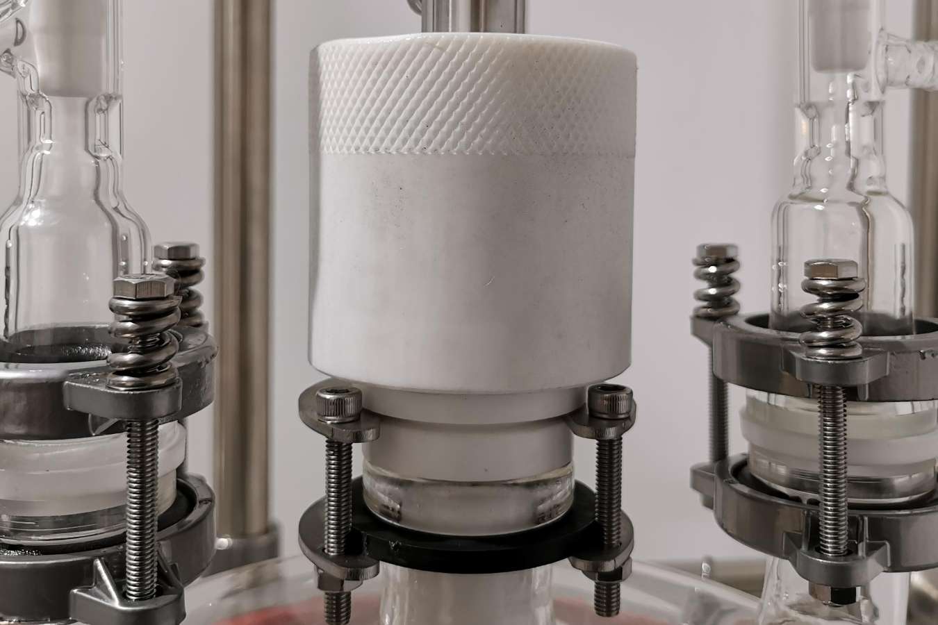 與物料接觸部分全部采用高硼硅玻璃(膨脹系數(shù)3.3)和聚四氟乙烯材料,性能穩(wěn)定不易與物料起化學(xué)反應(yīng),使用方便安全。