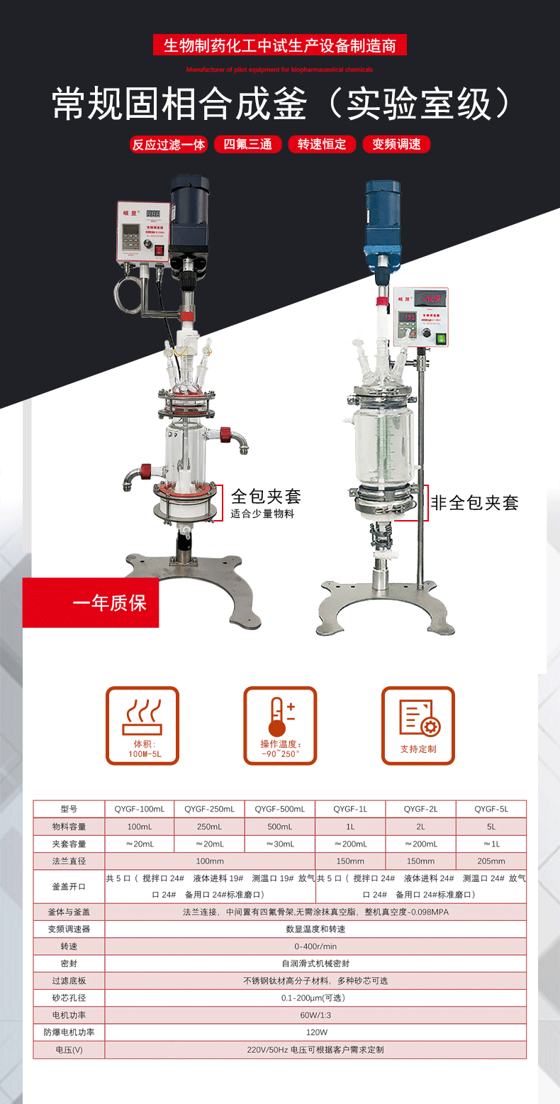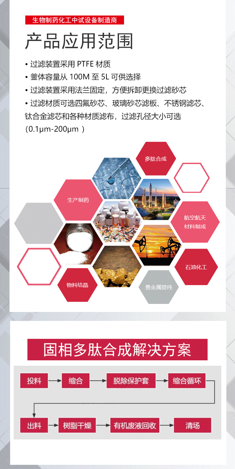 該款雙層玻璃多肽固相合成反應(yīng)釜采用全夾套釜體,微米級(jí)孔徑的四氟過濾底板,反應(yīng)穩(wěn)定,耐腐蝕能力強(qiáng)