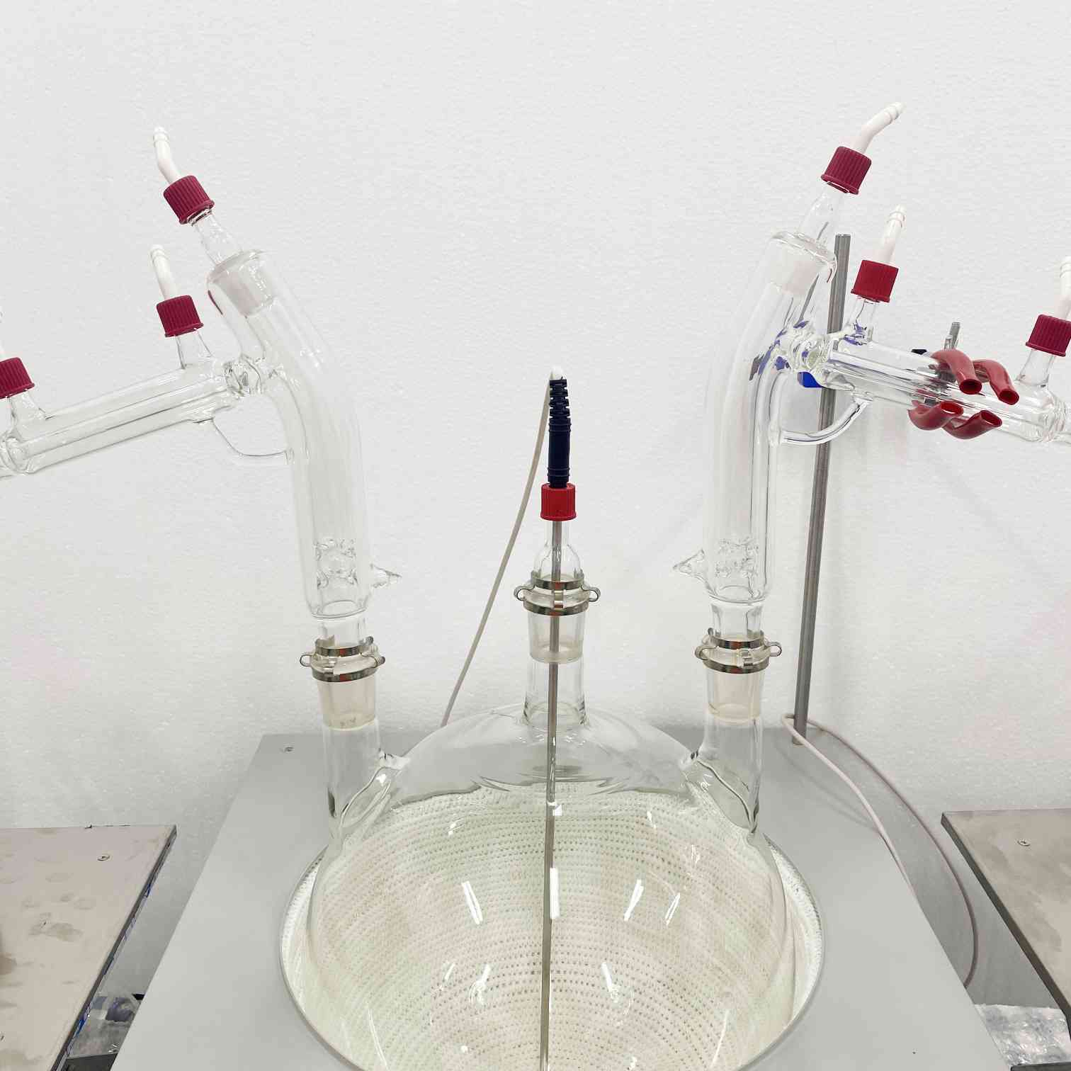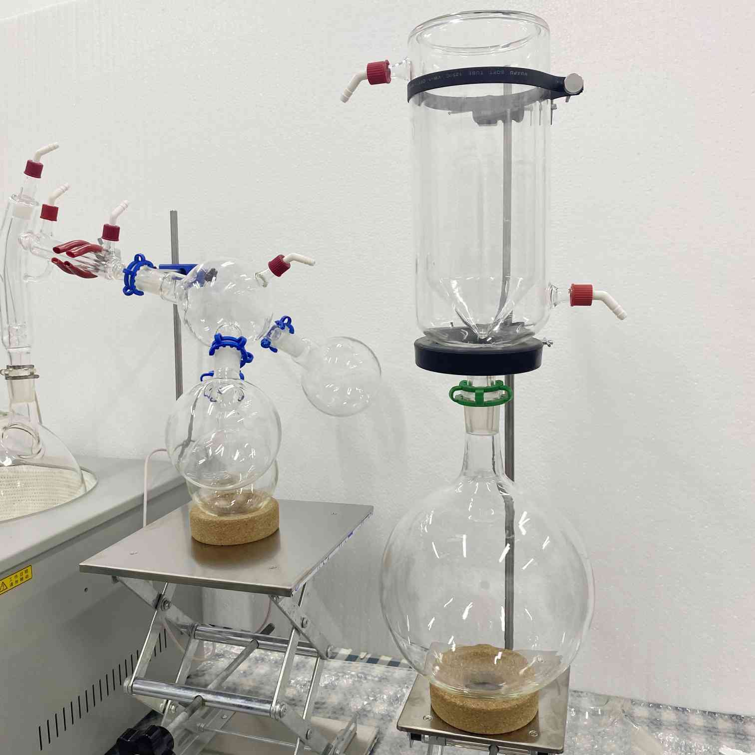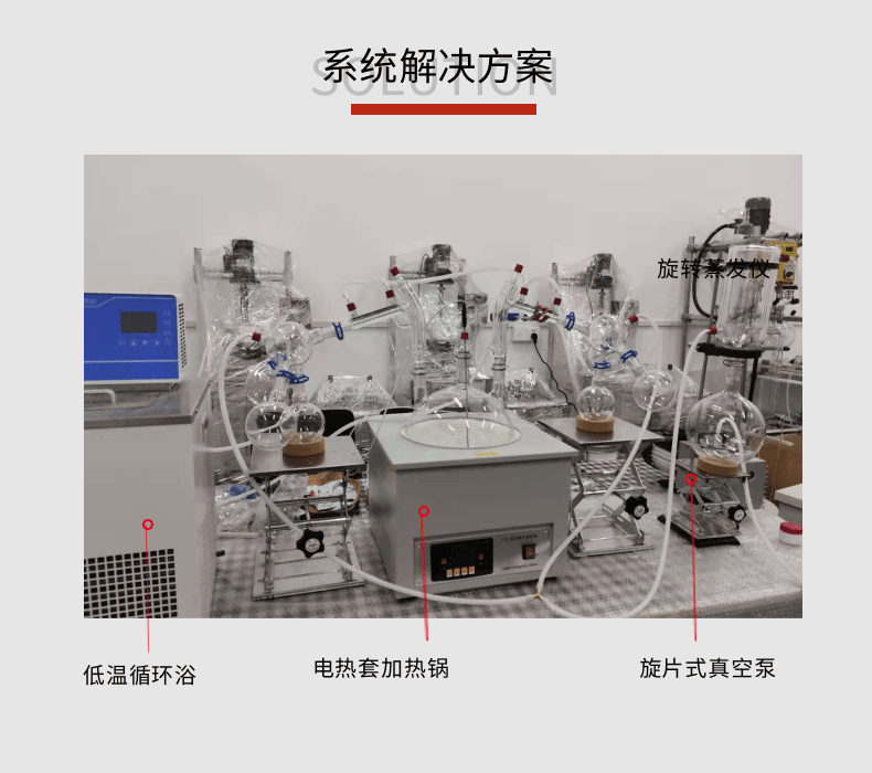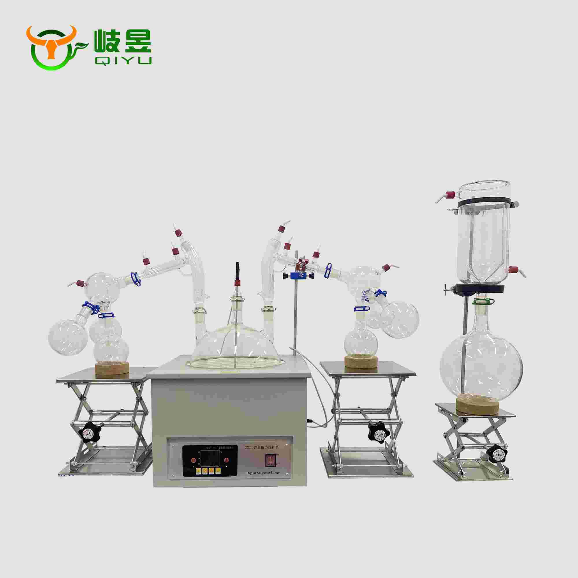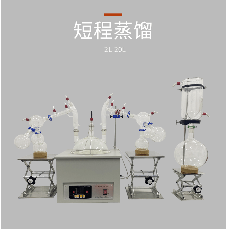 物料從蒸發(fā)器的頂部加入,經(jīng)轉(zhuǎn)子上的料液分布器將其連續(xù)均勻地分布在加熱面上,隨即刮膜器將料液刮成一層極薄、呈湍流狀的液膜,并以螺旋狀向下推進(jìn)。在此過(guò)程中,從加熱面上逸出的輕組分,經(jīng)過(guò)很短的路線和幾乎未經(jīng)碰撞就到內(nèi)置冷凝器上冷凝成液,并沿冷凝器管流下,通過(guò)位于蒸發(fā)器底部的出料管排出;殘液即重組分在加熱區(qū)下的圓形通道中收集,再通過(guò)側(cè)面的出料管中流出。